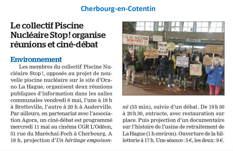 Soirée ciné-débat à Cherbourg le 11 mai, manifestation à Cherbourg le 18 juin. Ainsi que d'interpeler personnellement les élus de leur commune mais aussi les députés, sur leur positionnement par rapport au projet EDF.